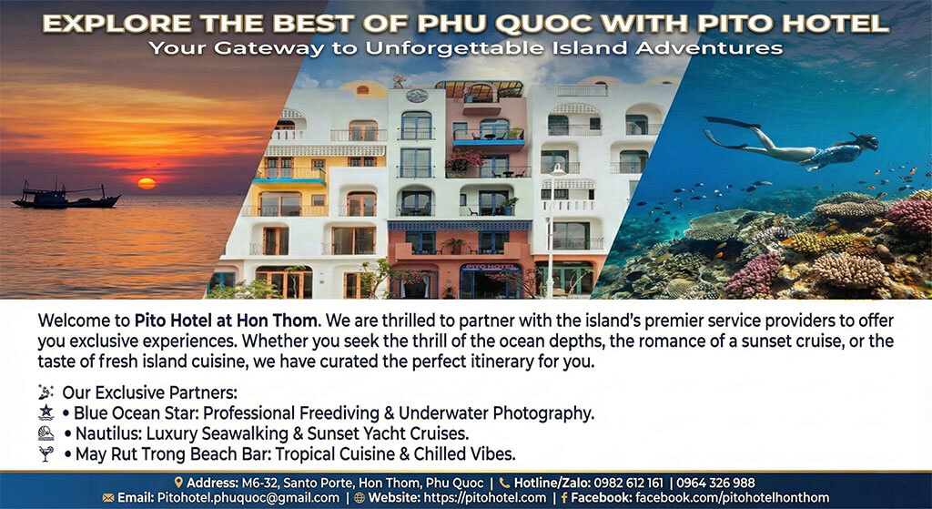 Khách sạn Pito là điểm check-in nổi bật ở Hòn Thơm, không gian đẹp kiểu Santorini, gần gũi thiên nhiên biển. Phù hợp nghỉ dưỡng, du lịch sinh thái và tham gia các tour biển.